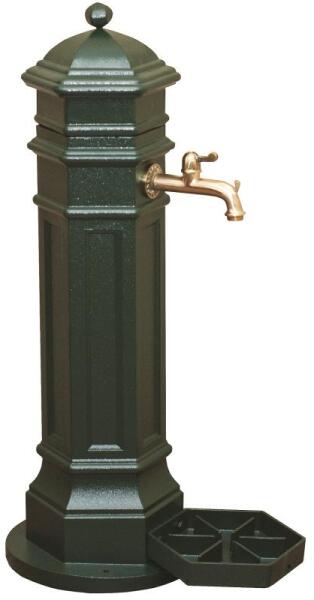 Pisa zöld színű alumínium állókút 26/01 Akerti kútsaját gyártásunk, anyaga alumínium öntvény, ezért 100%-ban rozsdamentes.  A festése ellen áll minden szélsőséges időjárási körülménynek. Üzembe helyezhető kültérre és beltérre egyaránt.  A hatszögletű állókút díszes ívei faragott hatást keltenek. A díszkutak bekötéséhezflexibilis vízbekötőcsövethasználjon.  A kerti kút betonhoz való rögzítése javasolt, ehhez színre festett csavart biztosítunk.  A kút felső kalap része leszerelhető, ezért könnyen tudja téliesíteni, illetve a csapot betonrögzítés után belülről fixálni vagy oldani. Ha a kutat két csappal vagy két vödörtartóval szeretné felár és előleg ellenében kivitelezzük.   Álló kerti kút adatok