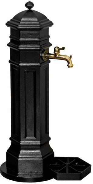 Pisa fekete színű alumínium állókút 26/03 Akerti kútsaját gyártásunk, anyaga alumínium öntvény, ezért 100%-ban rozsdamentes.  A festése ellen áll minden szélsőséges időjárási körülménynek. Üzembe helyezhető kültérre és beltérre egyaránt.  A hatszögletű állókút díszes ívei faragott hatást keltenek. A díszkutak bekötéséhezflexibilis vízbekötőcsövethasználjon.  A kerti kút betonhoz való rögzítése javasolt, ehhez színre festett csavart biztosítunk.  A kút felső kalap része leszerelhető, ezért könnyen tudja téliesíteni, illetve a csapot betonrögzítés után belülről fixálni vagy oldani. Ha a kutat két csappal vagy két vödörtartóval szeretné felár és előleg ellenében kivitelezzük.   Álló kerti kút adatok