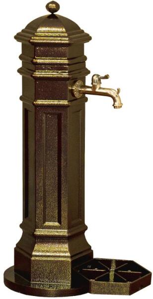 Pisa Kalapácslakk arany színű alumínium állókút 26/05 Akerti kútsaját gyártásunk, anyaga alumínium öntvény, ezért 100%-ban rozsdamentes.  A festése ellen áll minden szélsőséges időjárási körülménynek. Üzembe helyezhető kültérre és beltérre egyaránt.  A hatszögletű állókút díszes ívei faragott hatást keltenek. A díszkutak bekötéséhezflexibilis vízbekötőcsövethasználjon.  A kerti kút betonhoz való rögzítése javasolt, ehhez színre festett csavart biztosítunk.  A kút felső kalap része leszerelhető, ezért könnyen tudja téliesíteni, illetve a csapot betonrögzítés után belülről fixálni vagy oldani. Ha a kutat két csappal vagy két vödörtartóval szeretné felár és előleg ellenében kivitelezzük.   Álló kerti kút adatok