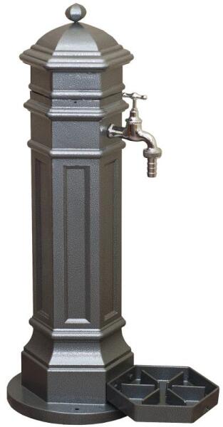 Pisa Kalapácslakk ezüst színű alumínium állókút 26/06 Akerti kútsaját gyártásunk, anyaga alumínium öntvény, ezért 100%-ban rozsdamentes.  A festése ellen áll minden szélsőséges időjárási körülménynek. Üzembe helyezhető kültérre és beltérre egyaránt.  A hatszögletű állókút díszes ívei faragott hatást keltenek. A díszkutak bekötéséhezflexibilis vízbekötőcsövethasználjon.  A kerti kút betonhoz való rögzítése javasolt, ehhez színre festett csavart biztosítunk.  A kút felső kalap része leszerelhető, ezért könnyen tudja téliesíteni, illetve a csapot betonrögzítés után belülről fixálni vagy oldani. Ha a kutat két csappal vagy két vödörtartóval szeretné felár és előleg ellenében kivitelezzük.   Álló kerti kút adatok