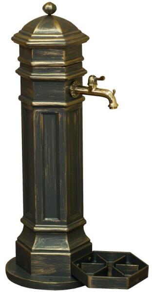 Pisa Antik arany színű alumínium állókút 26/10 Akerti kútsaját gyártásunk, anyaga alumínium öntvény, ezért 100%-ban rozsdamentes.  A festése ellen áll minden szélsőséges időjárási körülménynek. Üzembe helyezhető kültérre és beltérre egyaránt.  A hatszögletű állókút díszes ívei faragott hatást keltenek. A díszkutak bekötéséhezflexibilis vízbekötőcsövethasználjon.  A kerti kút betonhoz való rögzítése javasolt, ehhez színre festett csavart biztosítunk.  A kút felső kalap része leszerelhető, ezért könnyen tudja téliesíteni, illetve a csapot betonrögzítés után belülről fixálni vagy oldani. Ha a kutat két csappal vagy két vödörtartóval szeretné felár és előleg ellenében kivitelezzük.   Álló kerti kút adatok