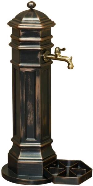 Pisa Antik bronz színű alumínium állókút 26/12 Akerti kútsaját gyártásunk, anyaga alumínium öntvény, ezért 100%-ban rozsdamentes.  A festése ellen áll minden szélsőséges időjárási körülménynek. Üzembe helyezhető kültérre és beltérre egyaránt.  A hatszögletű állókút díszes ívei faragott hatást keltenek. A díszkutak bekötéséhezflexibilis vízbekötőcsövethasználjon.  A kerti kút betonhoz való rögzítése javasolt, ehhez színre festett csavart biztosítunk.  A kút felső kalap része leszerelhető, ezért könnyen tudja téliesíteni, illetve a csapot betonrögzítés után belülről fixálni vagy oldani. Ha a kutat két csappal vagy két vödörtartóval szeretné felár és előleg ellenében kivitelezzük.   Álló kerti kút adatok